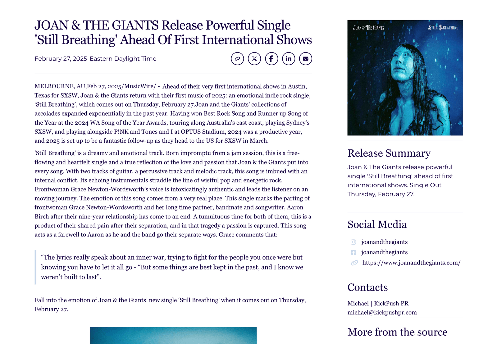 Include Instagram, TikTok, X, Facebook, or Bandcamp links so editors and fans can follow, share, and tag you in one tap—turning press traction into fresh followers, cross-platform buzz, and stronger social proof.